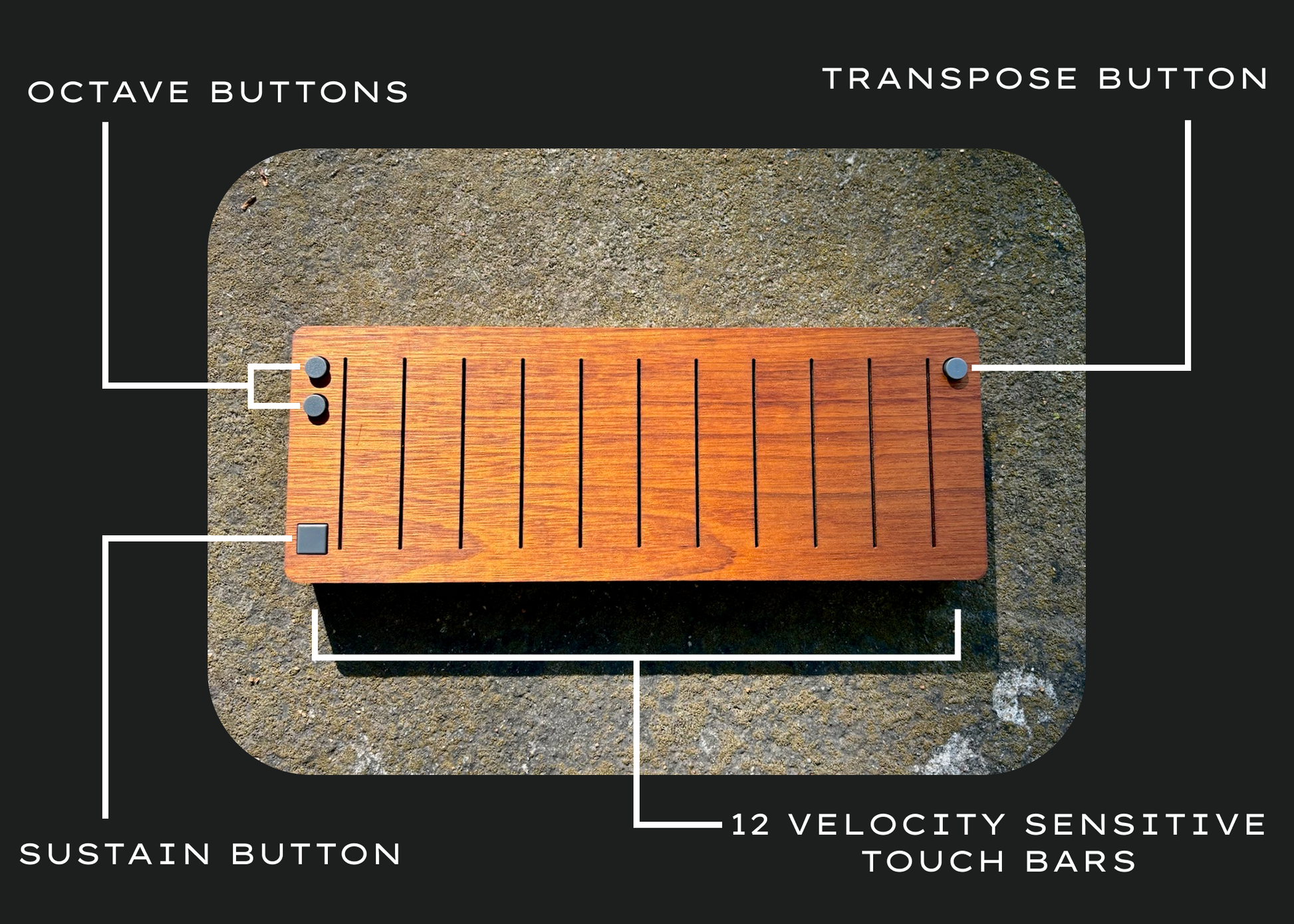 - 12 leds have been added to the interior of the device that can be seen through the slits of the wooden Touch Bars. These lights give the user feedback when making functionality changes (octave, transpose, sustain). Press the transpose button and watch the lights indicate the current transposition. when transpose is at 0 you will see two center lights flashing. You can transpose a maximum of +6 semitones up and a minimum of -5 semitones down from center (0). To transpose, press and release the transpose button and then tap one of the 12 Touch Bars. You will see the lights indicate the new transposition amount.